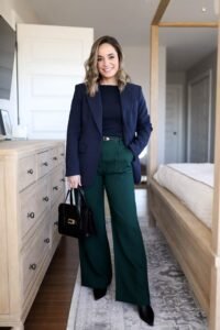 Anda dapat mencoba kombinasi seperti kemeja hijau botol dengan celana navy, atau menggunakan hijab hijau zamrud dengan blouse biru dongker. Perpaduan ini tepat untuk kegiatan formal, seperti meeting, seminar, atau acara bisnis. Perpaduan warna ini untuk pakaian kerja atau jenis kegiatan formal lainnya, tidak hanya membuat Anda tampil profesional tetapi juga stylish. Karena tampilan profesional tidak harus kaku, tetapi juga bisa stylish dan elegan seperti perpaduan kedua warna ini.