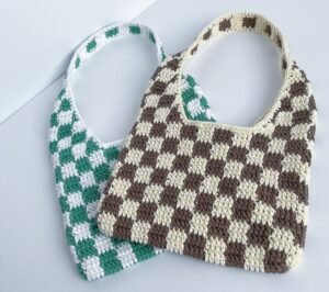 Pola papan catur atau checkerboard secara aktif membawa energi retro yang segar ke dalam kancah mode modern. Dalam variasi rajut totebag, pola ini tidak hanya sekadar motif dekoratif, melainkan sebuah pernyataan gaya yang menunjukkan karakter berani dan dinamis. Para desainer menggunakan teknik pergantian warna benang yang presisi untuk menciptakan kontras kotak-kotak yang tajam. Hal ini akan menghasilkan distorsi visual yang menarik perhatian namun tetap terlihat terorganisir secara simetris. Popularitas motif ini di Pinterest membuktikan bahwa elemen grafis yang kuat mampu mentransformasi busana yang paling sederhana sekalipun.
